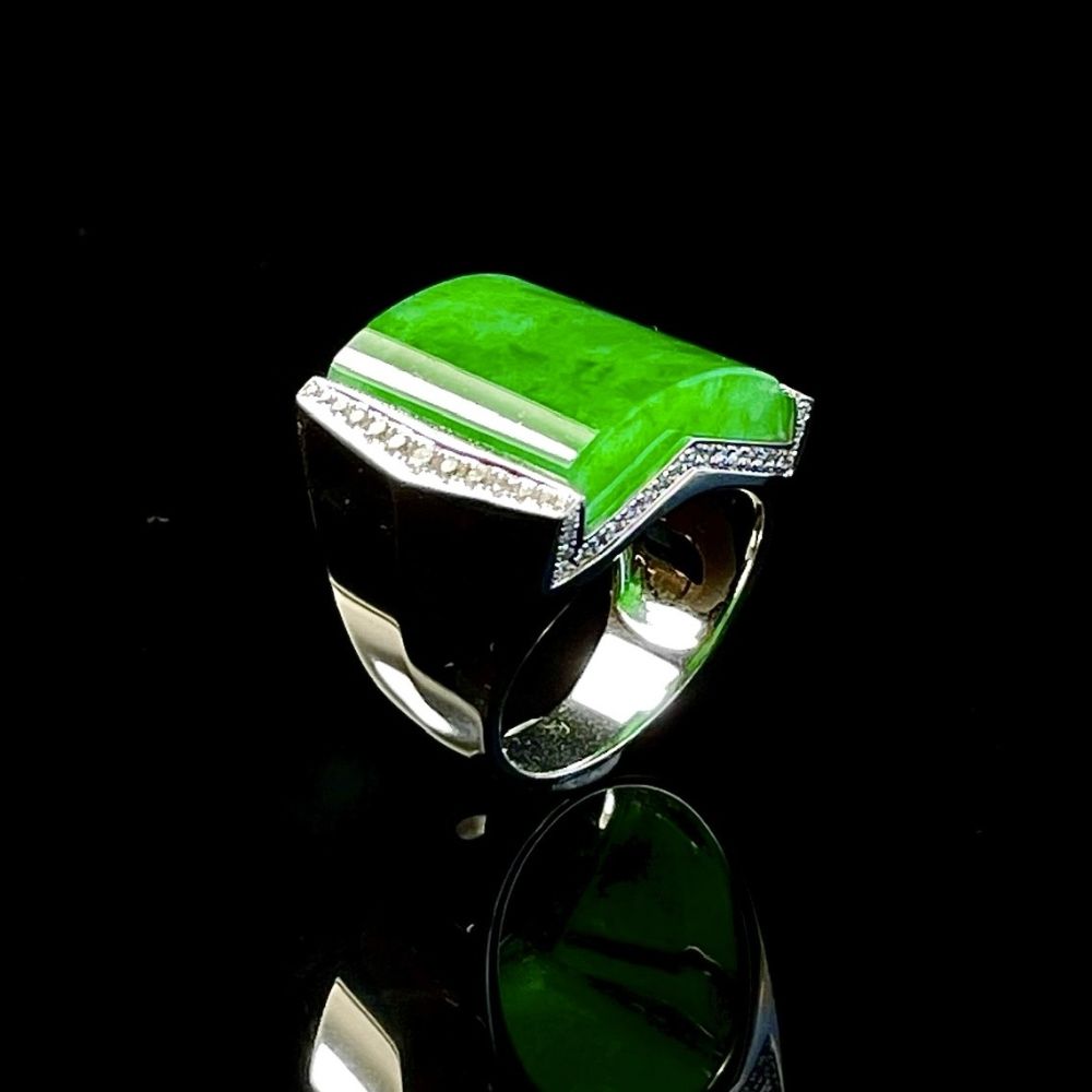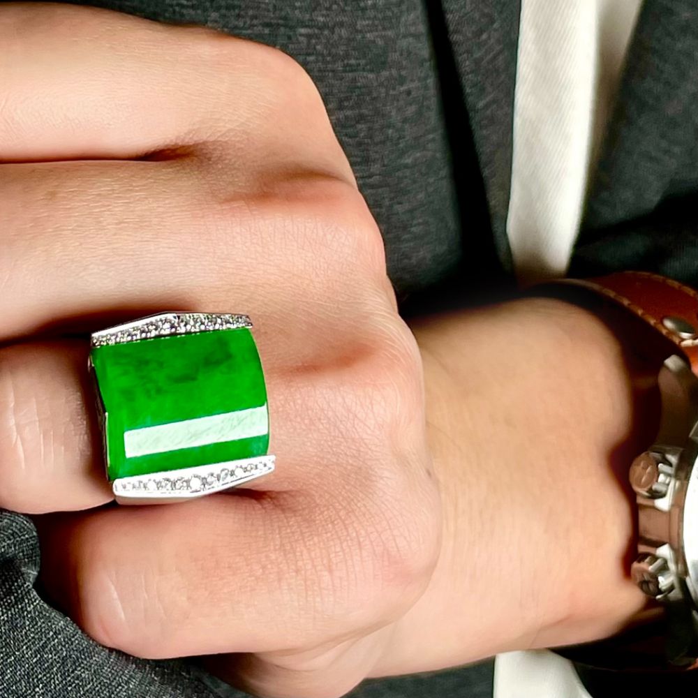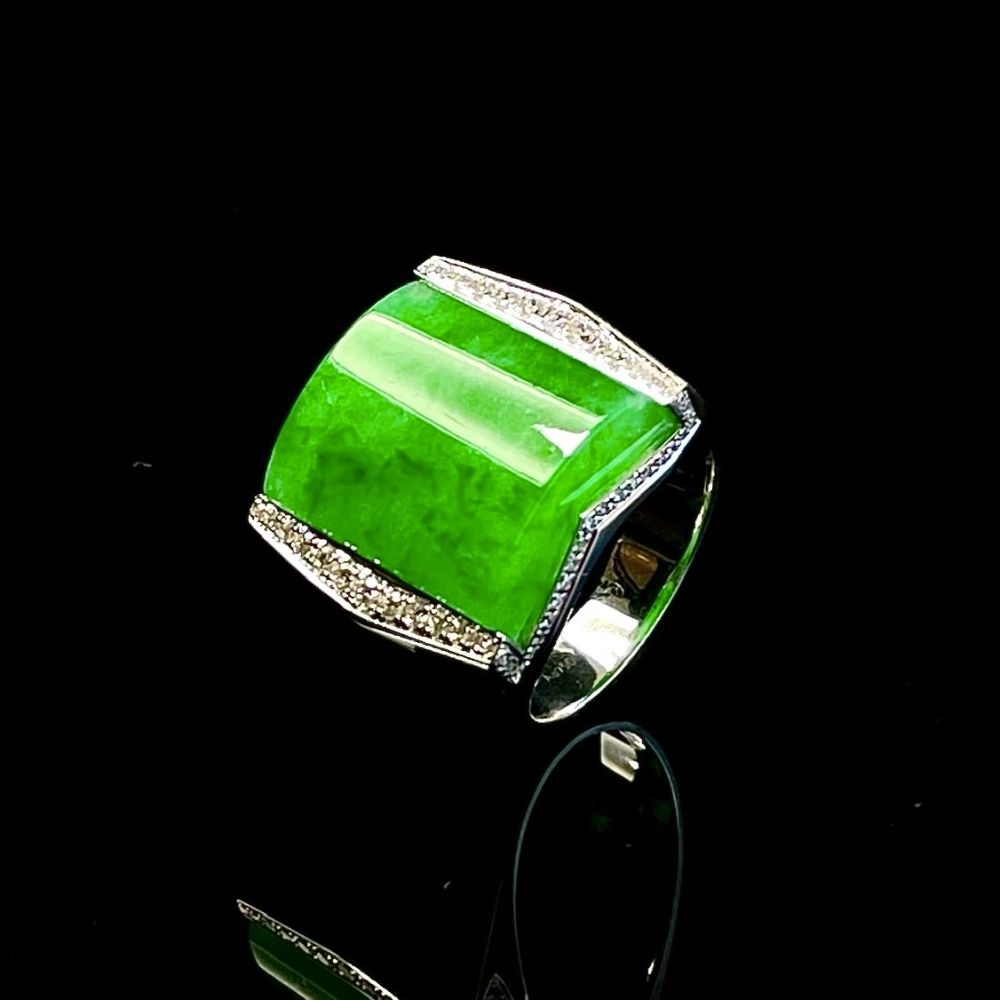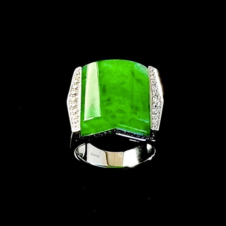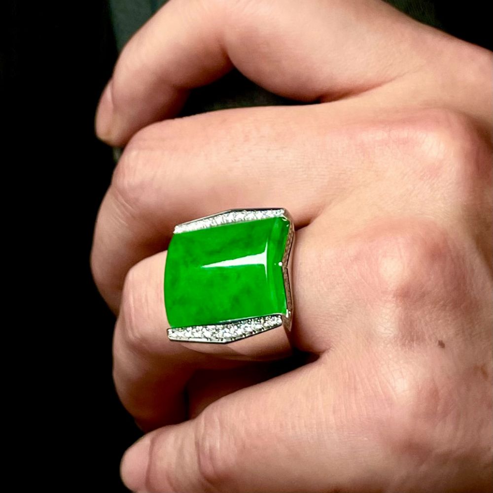 珍しく美しい金糸種翡翠の角型蛋面は、氷のように透き通り厚みがあり、余分な彫刻もなく、翠緑の色合いが薫り高く目を引きます。緑の模様は唯で意気込みがあり、独特の風韻を持ち、控えめの中に贅沢な質感が滲み出ています。指輪台は簡単で立派で、古典と現代が融合したスタイルの美学を際立たせています。