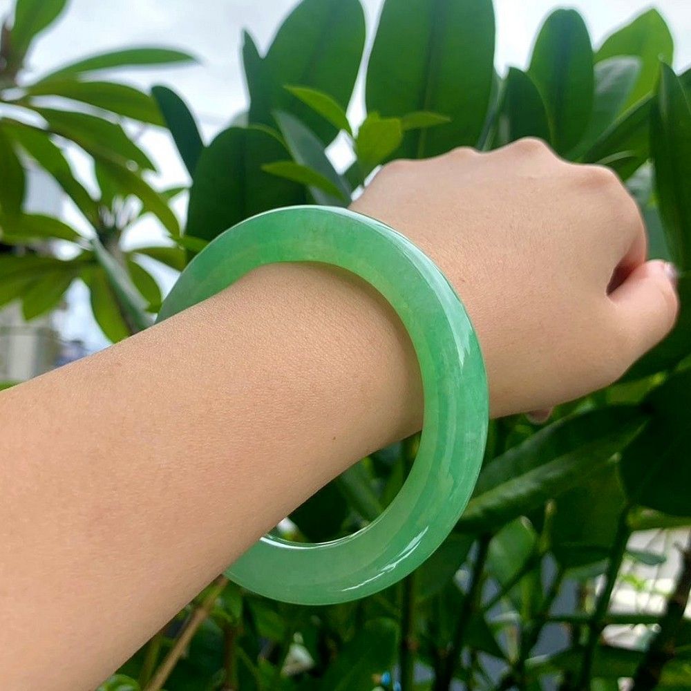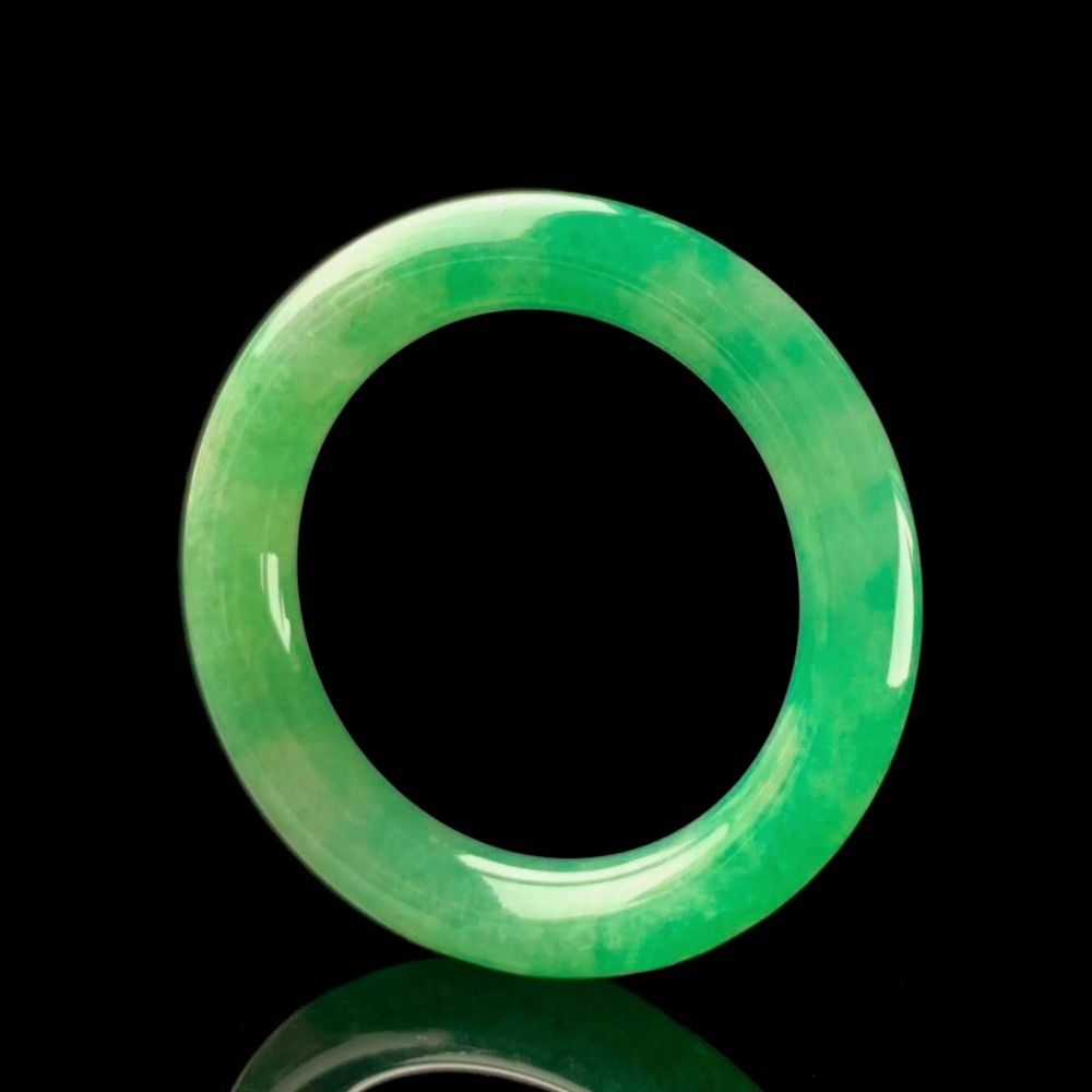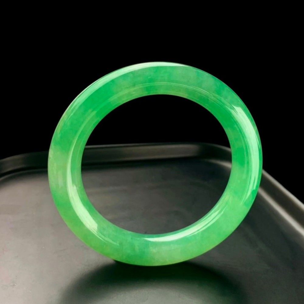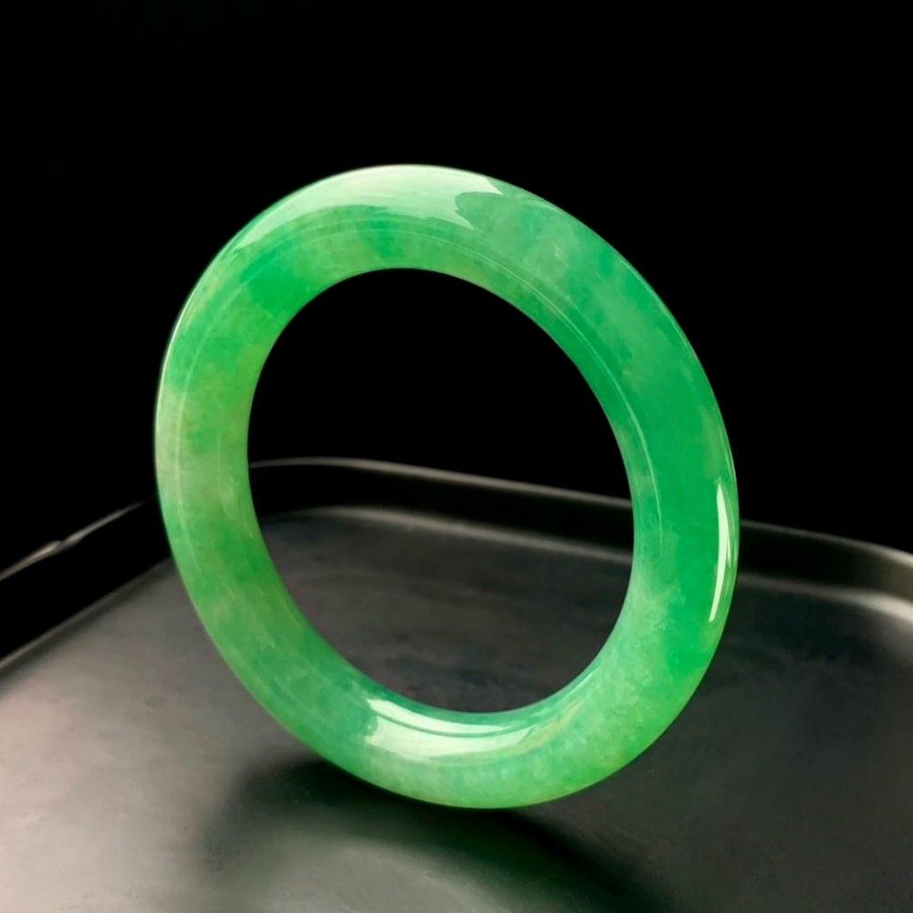 翡翠文化を最も典雅に、かつ代表的に体現するバングルの形制で、輪全体に広がる翠緑の清雅な色彩が、緻密な地肌に溶け込んでいます。手を挙げ足を踏むごとに、高貴な雰囲気と非凡な品格が溢れ、収集家にとって見逃せない伝世のクラシック逸品です!